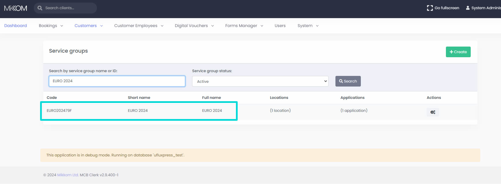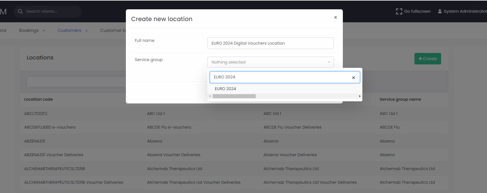 Next we will have to define a new Location in order for this Service to operate. It does not matter if this is a Voucher Service. A location is still needed as part of the way the system operates. in order to do that, go to the "Locations" page and click on the green "Create" button. Specify a name for the new location (we recommend that an easily distinguishable name is used) and in the "Service group" field search for the Customer for which you are setting up the dual portal.